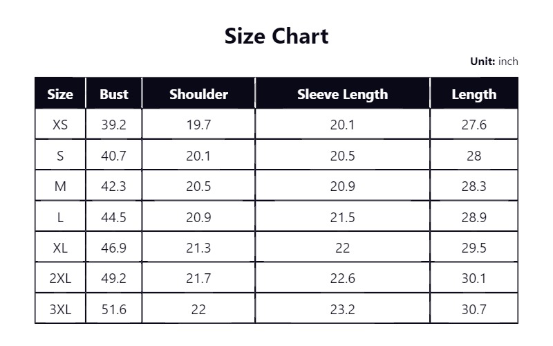 | Size | XS, S, M, L, XL, 2XL, 3XL |