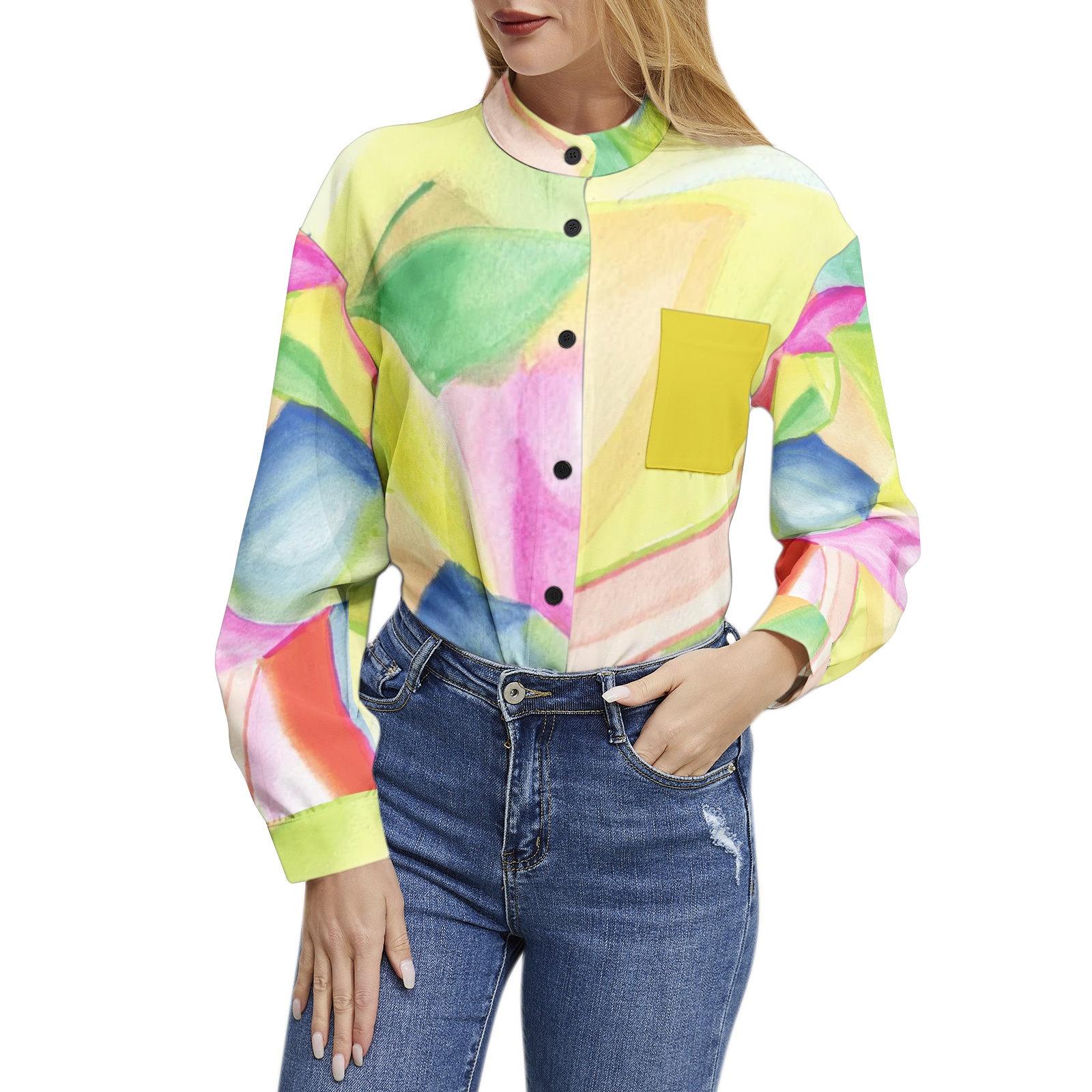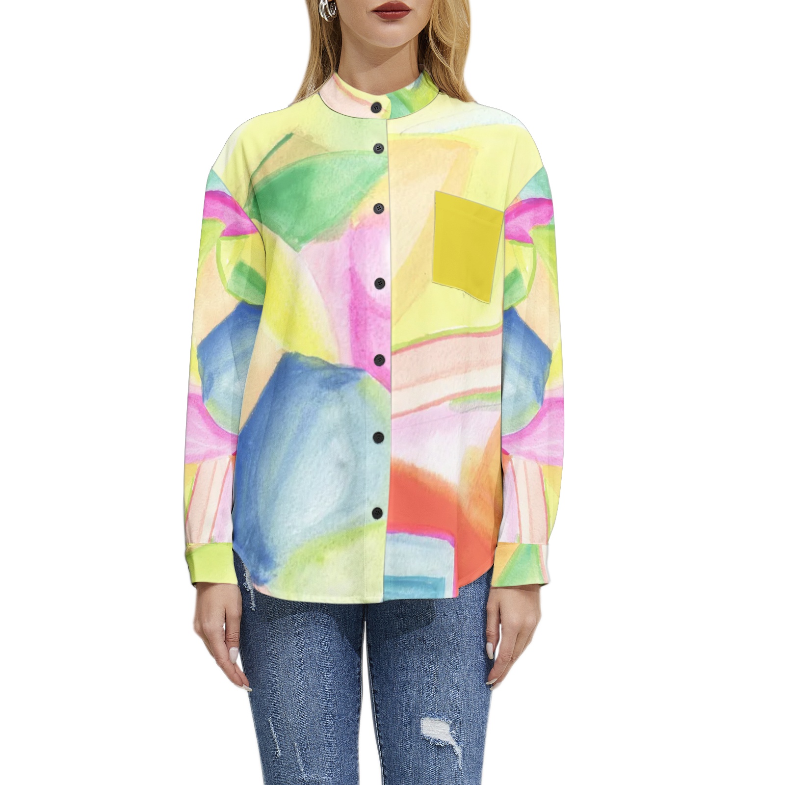 An elegant long sleeved shirt with button up and a mock neck. The fit is regular with spring colors that combine easily with blue, red, yellow, green and blue colors.